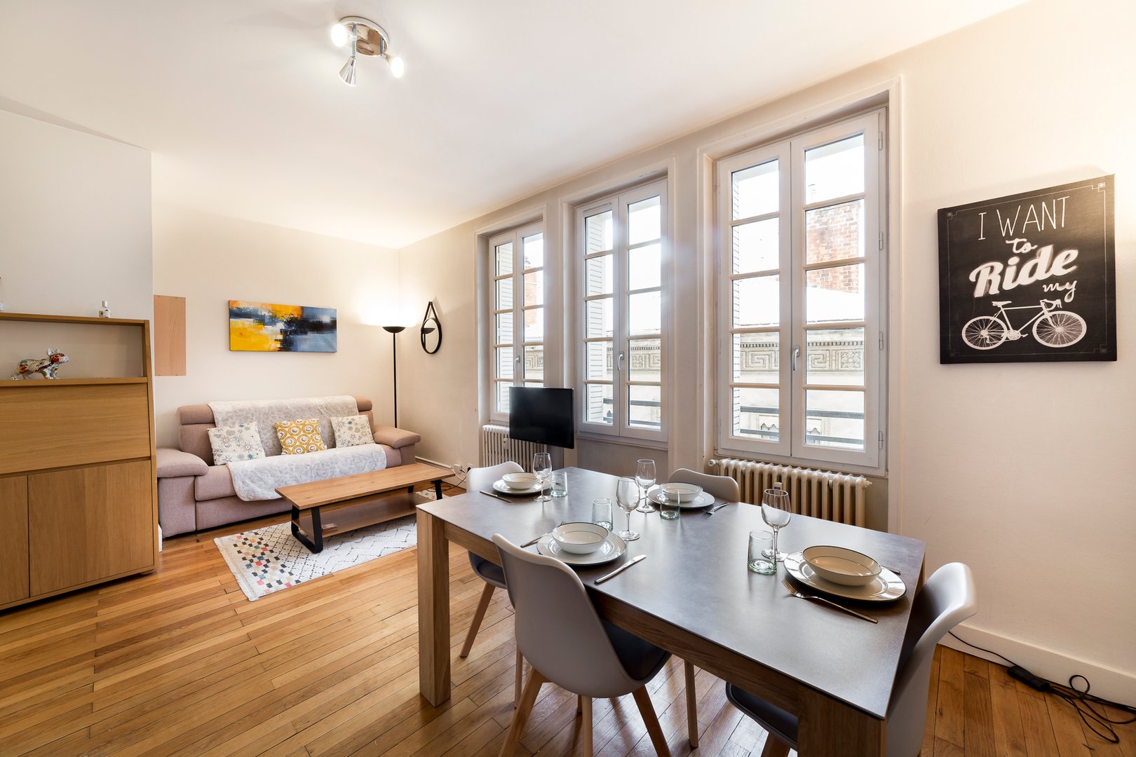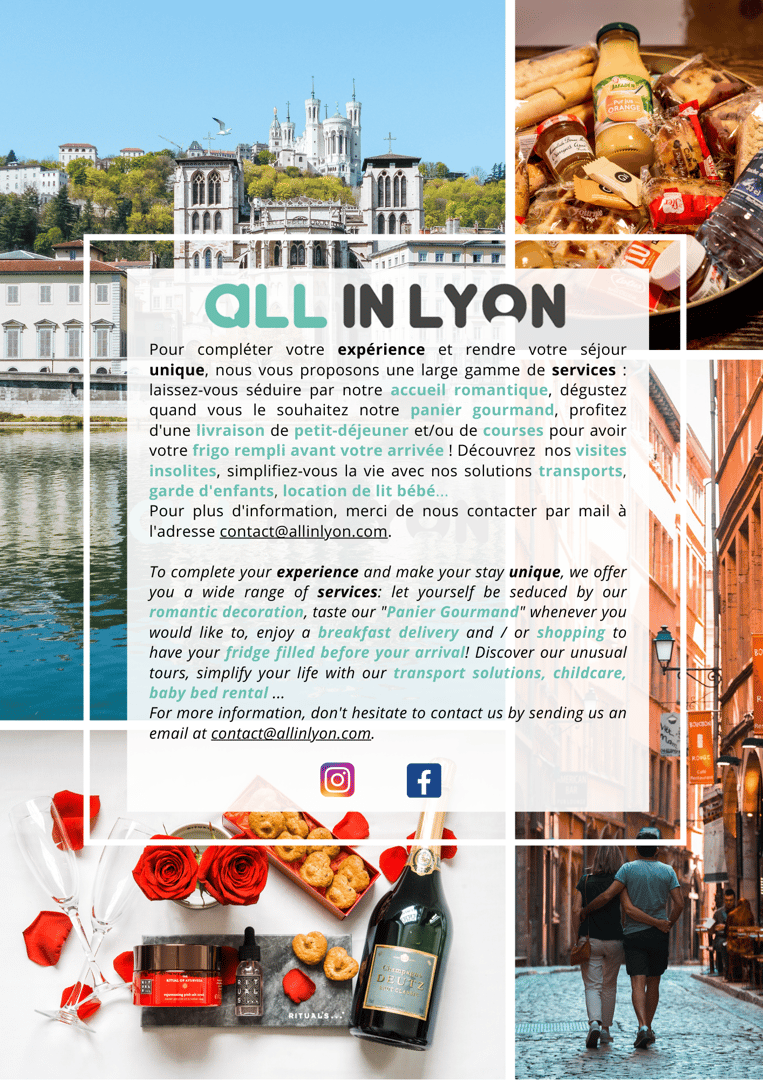 Duplex de charme de 47m² et lumineux idéal pour accueillir jusqu'à 5 personnes avec sa chambre et sa mezzanine équipées de lits 140x200. En plein centre de Lyon avec panorama unique sur les toits de l'église St Nizier et la Basilique de Fourvière, vous profiterez d'un des meilleurs quartier de Lyon pour passer un séjour de qualité.