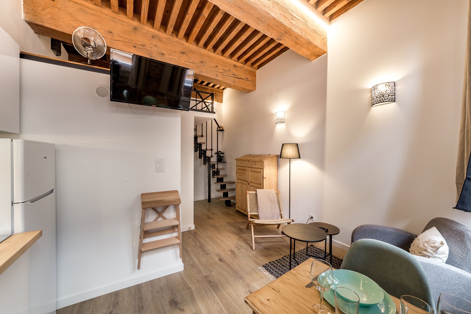 Charmant studio atypique de 22m² parfaitement aménagé et équipé. Laissez vous séduire par ses poutres apparentes et sa décoration épurée afin de passer un séjour de qualité. Parfait pour un séjour en couple, touristique ou professionnel, vous serez idéalement situé dans le c?ur du quartier historique. Proche de tous les commerces et restaurants.